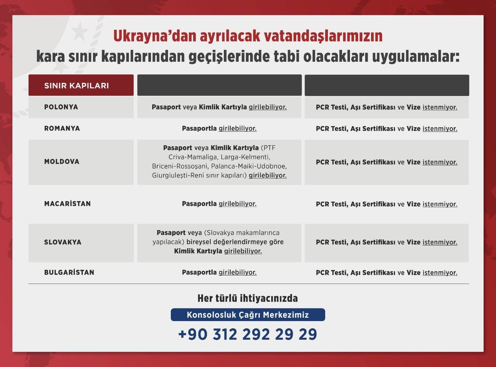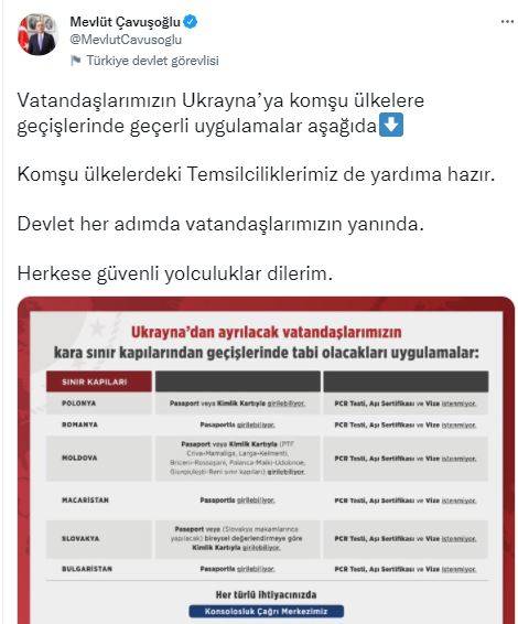 Bakan Çavuşoğlu, "Vatandaşlarımızın Ukrayna’ya komşu ülkelere geçişlerinde geçerli uygulamalar; Komşu ülkelerdeki Temsilciliklerimiz de yardıma hazır. Devlet her adımda vatandaşlarımızın yanında. Herkese güvenli yolculuklar dilerim" dedi.