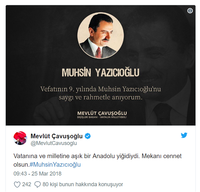 Dışişleri Bakanı Mevlüt Çavuşoğlu, vefatının 9. yılında BBP’nin merhum lideri Muhsin Yazıcıoğlu hakkında dikkat çeken bir paylaşımda bulundu.