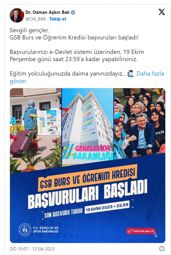 Gençlik ve Spor Bakanı Osman Aşkın Bak, Kredi ve Yurtlar Genel Müdürlüğünün 2023-2024 eğitim öğretim yılı için burs/kredi başvurularının başladığını duyurdu.