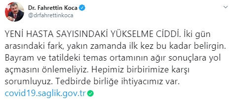 Sağlık Bakanı Fahrettin Koca son verilere ilişkin yaptığı açıklamada, "Yeni hasta sayısındaki yükselme ciddi. İki gün arasındaki fark, yakın zamanda ilk kez bu kadar belirgin. Bayram ve tatildeki temas ortamının ağır sonuçlara yol açmasını önlemeliyiz. Hepimiz birbirimize karşı sorumluyuz. Tedbirde birliğe ihtiyacımız var" ifadelerini kullandı.