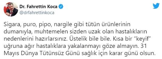 Bakan Koca yaptığı paylaşımda tütün ve tütün ürünlerinin birçok hastalığı tetiklediğine dikkat çekerek, "Sigara, puro, pipo, nargile gibi tütün ürünlerinin dumanıyla, muhtemelen sizden uzak olan hastalıkların nedenlerini hazırlarsınız. Üstelik bile bile. Kısa bir 'keyif' uğruna ağır hastalıklara yakalanmayı göze almayın. 31 Mayıs Dünya Tütünsüz Günü sağlık için karar günü olsun" ifadelerine yer verdi.