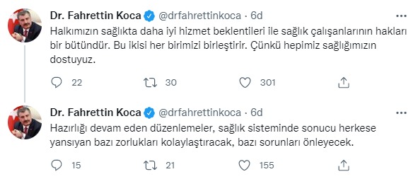 Sağlık çalışanlarının sorunlarını çözmeye yönelik hazırlanan düzenlemeye ilişkin Sağlık Bakanı Fahrettin Koca sosyal medya hesabı üzerinden dikkat çeken bir paylaşım yaptı.