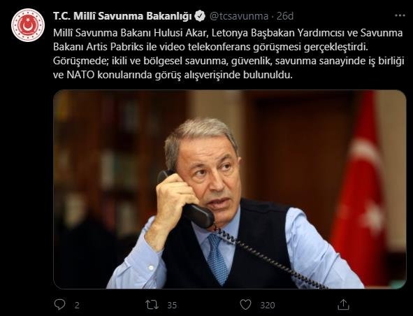 Milli Savunma Bakanlığı'nın (MSB) Twitter hesabından yapılan açıklamada, "Millî Savunma Bakanı Hulusi Akar, Letonya Başbakan Yardımcısı ve Savunma Bakanı Artis Pabriks ile video telekonferans görüşmesi gerçekleştirdi. Görüşmede; ikili ve bölgesel savunma, güvenlik, savunma sanayinde iş birliği ve NATO konularında görüş alışverişinde bulunuldu" denildi.