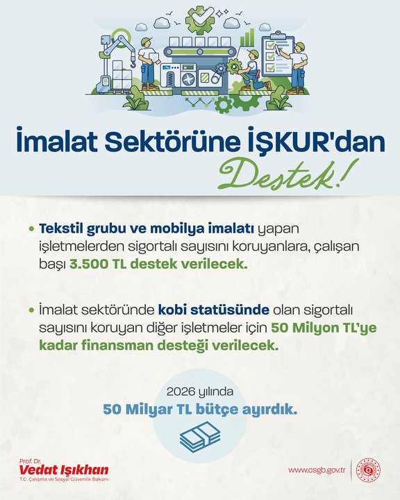 Bakan Vedat Işıkhan, sosyal medya hesabından "İmalat sektörüne İŞKUR'dan güçlü destek" başlıklı paylaşım yaptı.