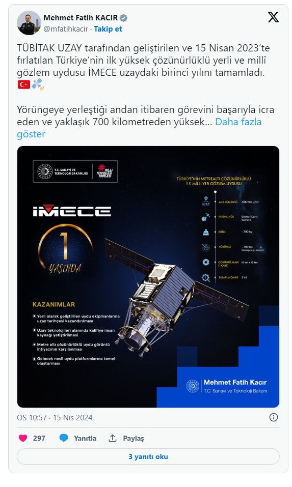 Sanayi ve Teknoloki Bakanı Mehmet Fatih Kacır şu ifadeleri kullandı: TÜBİTAK UZAY tarafından geliştirilen ve 15 Nisan 2023’te fırlatılan Türkiye’nin ilk yüksek çözünürlüklü yerli ve millî gözlem uydusu İMECE uzaydaki birinci yılını tamamladı.