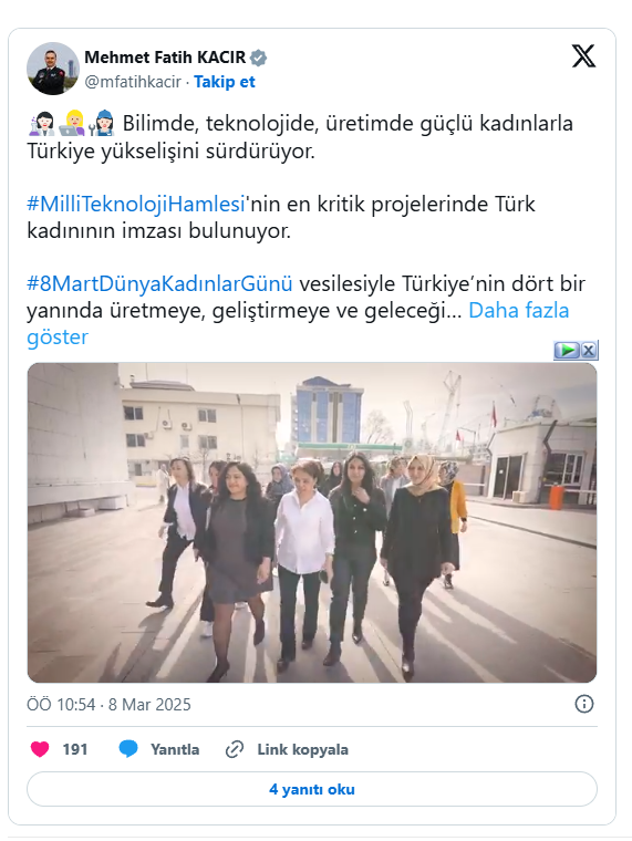 Sanayi ve Teknoloji Bakanı Mehmet Fatih Kacır, 8 Mart Dünya Kadınlar Günü mesajında, "Milli Teknoloji Hamlesi'nin en kritik projelerinde Türk kadınının imzası bulunuyor" dedi.
