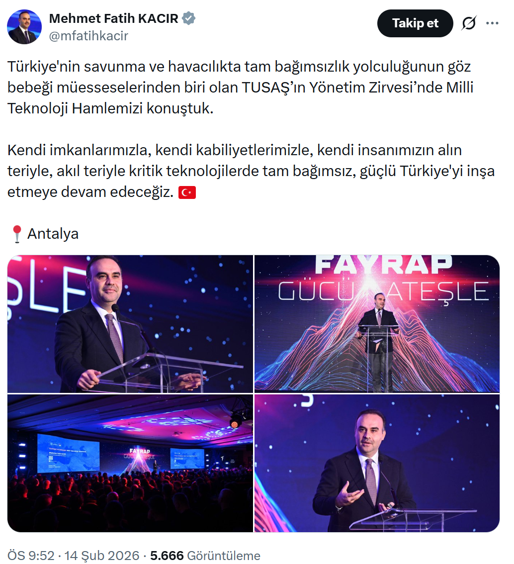 Kacır, ABD merkezli X şirketinin sosyal medya platformundaki hesabından yaptığı paylaşımında, Antalya'da gerçekleştirilen, Türk Havacılık ve Uzay Sanayii'nin (TUSAŞ) stratejik rotasının belirlendiği "TUSAŞ 2026 Yönetim Zirvesi" programına katıldığını belirtti.