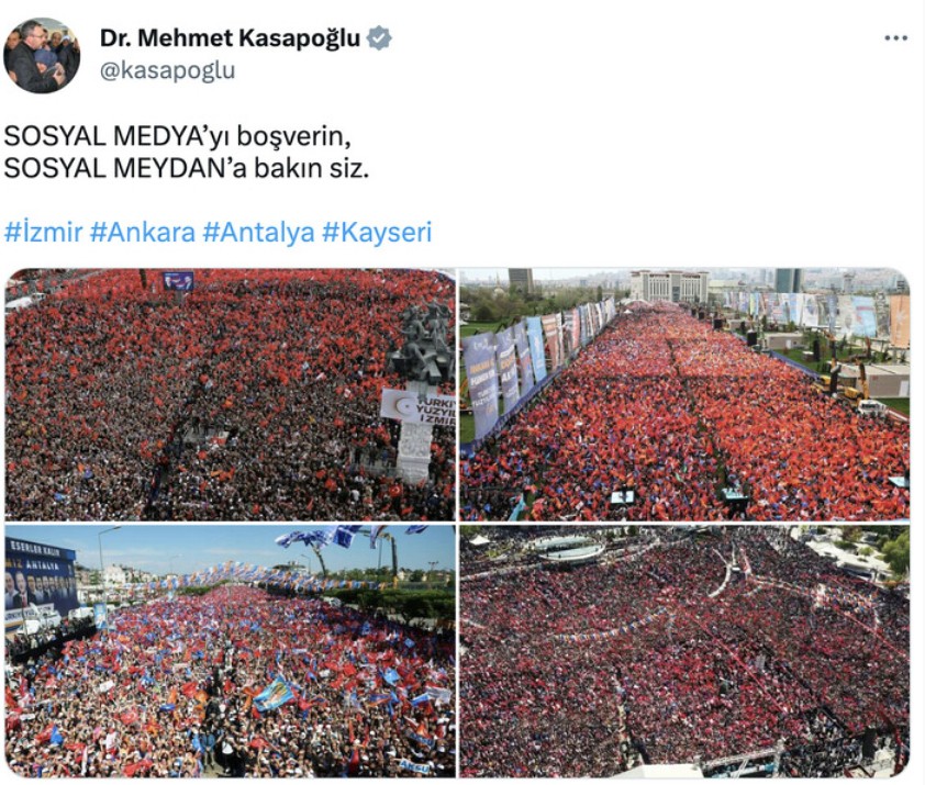Gençlik ve Spor Bakanı Mehmet Kasapoğlu, Cumhurbaşkanı Erdoğan'ın İzmir, Ankara, Antalya ve Kayseri'deki mitinglerinden kareleri paylaşarak, "Sosyal medyayı boşverin, sosyal meydana bakın siz" dedi.