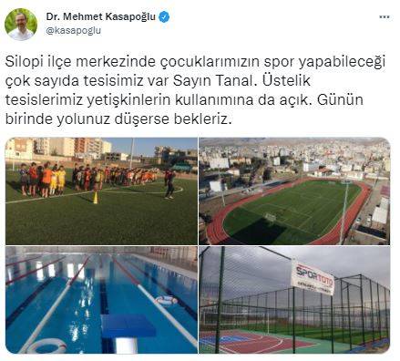 CHP İstanbul Milletvekili Mahmut Tanal’ın sosyal paylaşım sitesi Twitter'dan "Silopi ilçe merkezinde çocuklarımızın spor yapabileceği alanlar, sahalar yok. Tarlada top koşturuyorlar" paylaşımına, Gençlik ve Spor Bakanı Mehmet Kasapoğlu’ndan “Günün birinde yolunuz düşerse bekleriz” cevabı geldi.