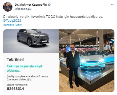Cumhurbaşkanı Recep Tayyip Erdoğan'ın da katılımıyla seri üretiminin yapılacağı Gemlik Kampüsü 29 Ekim 2022 tarihinde açılan ve son günlerde ön siparişleri alınmaya başlanan TOGG'a bir sipariş de Bakan Mehmet Muharrem Kasapoğlu'ndan geldi.