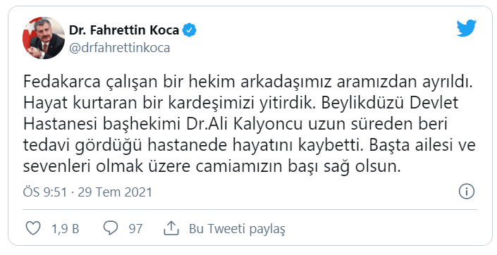 Bakan Koca paylaşımında, "Fedakarca çalışan bir hekim arkadaşımız aramızdan ayrıldı. Hayat kurtaran bir kardeşimizi yitirdik. Beylikdüzü Devlet Hastanesi başhekimi Dr.Ali Kalyoncu uzun süreden beri tedavi gördüğü hastanede hayatını kaybetti. Başta ailesi ve sevenleri olmak üzere camiamızın başı sağ olsun." dedi.