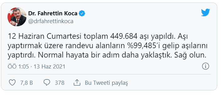 Sağlık Bakanı Fahrettin Koca, son 24 saat içinde toplam 449 bin 684 doz koronavirüs aşısı yapıldığını belirterek, normalleşmeye bir adım daha yaklaşıldığını söyledi.