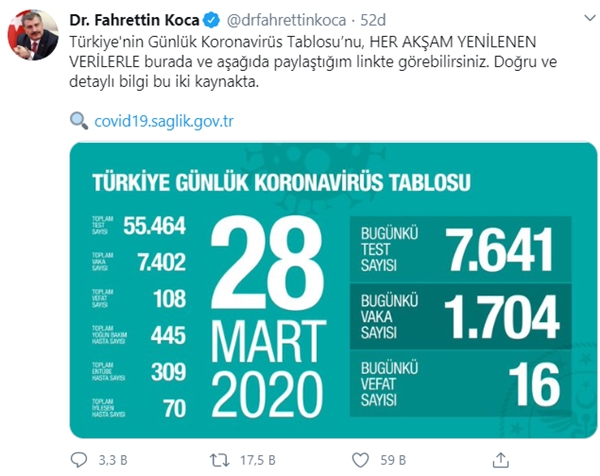 Sağlık Bakanı Fahrettin Koca, bugün 7641 test yapıldığını, 1704 yeni vakanın tespit edildiğini ve 16 kişinin hayatını kaybettiğini açıkladı. Bakan Koca'nın açıkladığı son verilere göre bugüne kadar toplamda 55 bin 464 test yapılırken toplam vaka sayısı 7 bin 402 olarak tespit edildi. Toplamda 108 vatandaşımız hayatını kaybederken iyileşen hasta sayısı ise 70'e yükseldi.