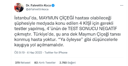 İstanbul’da, maymun çiçeği hastası olabileceği şüphesiyle medyada konu edilen 4 kişi için gerekli testler yapılmış, 4’ünün de test sonucu negatif çıkmıştır. Türkiye’de, şu ana dek maymun çiçeği tanısı konmuş hasta yoktur. "Ya öyleyse" gibi düşüncelerle kaygıya yol açılmamalıdır.