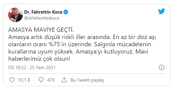 Bakan Koca, "En az bir doz aşı olanların oranı yüzde 75'in üzerinde. Salgınla mücadelenin kurallarına uyum yüksek. Amasya'yı kutluyoruz. Mavi haberlerimiz çok olsun" ifadesini kullandı.