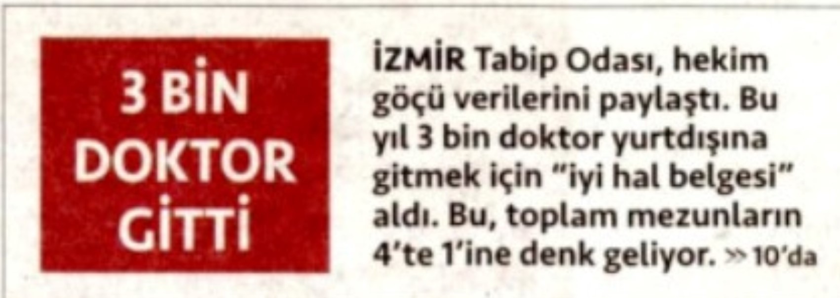 2023’te alınan İyi Hal Belgesi sayısı üzerinden, “Doktorlar yurt dışına kaçıyor” mesajı veren Cumhuriyet, haberinde, “3 bin doktor gitti. İzmir Tabip Odası, hekim göçü verilerini paylaştı. Bu yıl 3 bin doktor yurtdışına gitmek için iyi hal belgesi aldı. Bu, toplam mezunların 4'te 1'ine denk geliyor.” ifadelerine yer verdi.