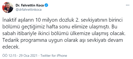 Koca, Twitter hesabından yaptığı paylaşımda, aşıların 10 milyon dozluk ikinci sevkiyatının birinci bölümünün 25 Ocak'ta Türkiye'ye ulaştığını hatırlatarak, "Bu sabah itibarıyla ikinci bölümü ülkemize ulaşmış olacak. Tedarik programına uygun olarak aşı sevkiyatı devam edecek." ifadelerini kullandı.