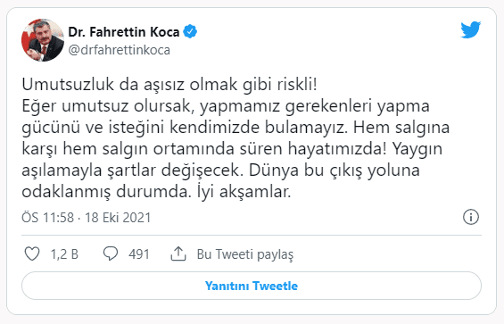 Bakan Koca, "Umutsuzluk da aşısız olmak gibi riskli. Eğer umutsuz olursak, yapmamız gerekenleri yapma gücünü ve isteğini kendimizde bulamayız. Hem salgına karşı hem salgın ortamında süren hayatımızda. Yaygın aşılamayla şartlar değişecek. Dünya bu çıkış yoluna odaklanmış durumda. İyi akşamlar" dedi.