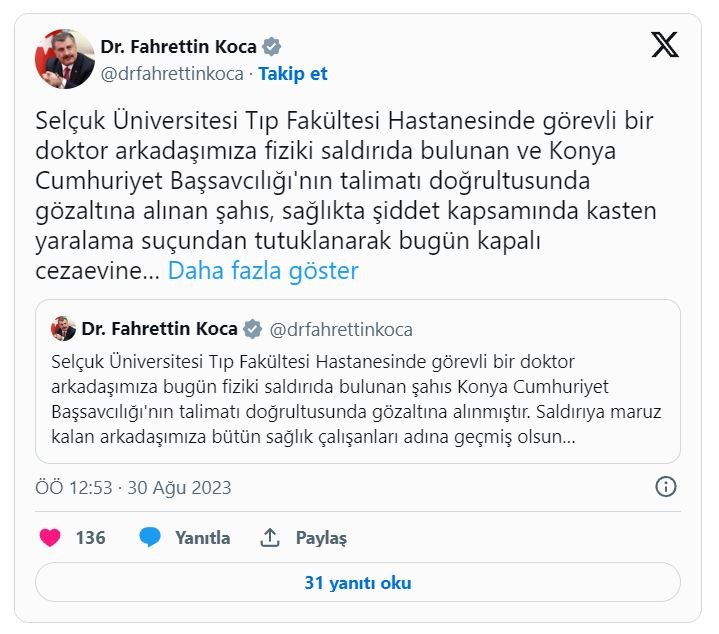 Twitter hesabından paylaşım yapan Bakan Koca, "Selçuk Üniversitesi Tıp Fakültesi Hastanesinde görevli bir doktor arkadaşımıza fiziki saldırıda bulunan ve Konya Cumhuriyet Başsavcılığı'nın talimatı doğrultusunda gözaltına alınan şahıs, sağlıkta şiddet kapsamında kasten yaralama suçundan tutuklanarak bugün kapalı cezaevine gönderilmiştir." ifadelerini kullandı.