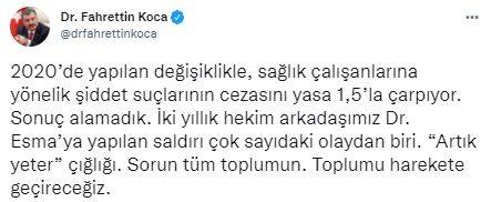 Koca, sosyal medya hesabından yaptığı paylaşımda, "2020'de yapılan değişiklikle, sağlık çalışanlarına yönelik şiddet suçlarının cezasını yasa 1,5'la çarpıyor. Sonuç alamadık. İki yıllık hekim arkadaşımız Dr. Esma'ya yapılan saldırı çok sayıdaki olaydan biri. 'Artık yeter' çığlığı. Sorun tüm toplumun. Toplumu harekete geçireceğiz." açıklamasında bulundu.