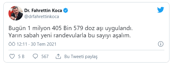 Bakan Koca, Twitter hesabından yaptığı açıklamada "Bugün(dün) 1 milyon 405 Bin 579 doz aşı uygulandı. Yarın sabah yeni randevularla bu sayıyı aşalım" ifadelerini kullandı.