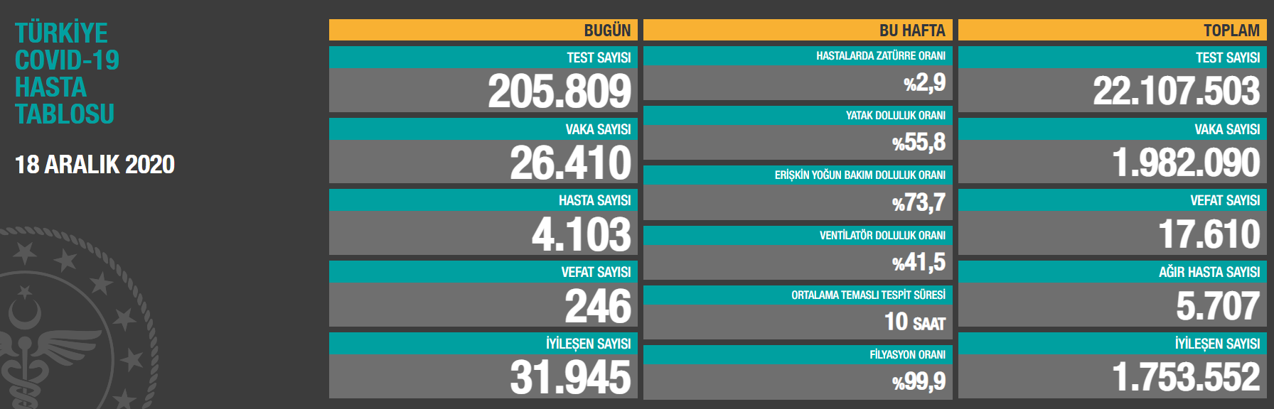 Son 24 saatte 205 bin 809 test yapılırken, 26 bin 410 yeni vaka, 4 bin 103 de yeni hasta tespit edildi. 18 Aralık 2020 Cuma günü 246 vatandaşımız koronavirüs sebebi ile hayatını kaybetti.