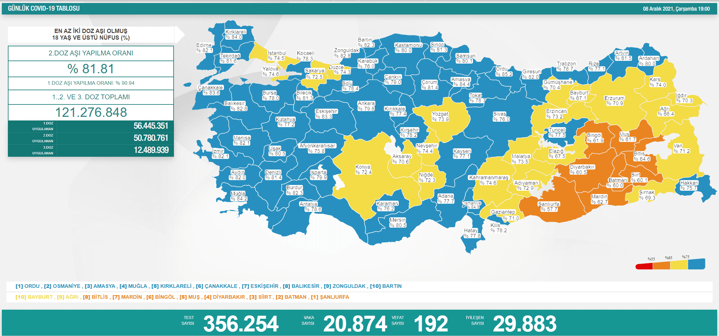 Buna göre; son 24 saatte, 356 bin 254 test yapılırken, 20 bin 874 yeni vaka tespit edildi. 192 vatandaşımız daha koronavirüs sebebi ile hayatını kaybetti. 8 Aralık 2021 Çarşamba günü 29 bin 883 hasta iyileşti.