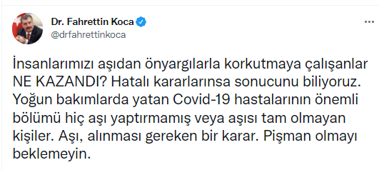 Verilerin açıklanmasından sonra Twitter hesabından paylaşımda bulunan Sağlık Bakanı Fahrettin Koca, "İnsanlarımızı aşıdan önyargılarla korkutmaya çalışanlar ne kazandı?" diye sordu. Yoğun bakımdaki hastaların büyük çoğunlunun aşısız kişilerden oluştuğunu belirten Bakan Koca, şöyle devam etti: "Hatalı kararlarınsa sonucunu biliyoruz. Yoğun bakımlarda yatan Covid-19 hastalarının önemli bölümü hiç aşı yaptırmamış veya aşısı tam olmayan kişiler. Aşı, alınması gereken bir karar. Pişman olmayı beklemeyin."