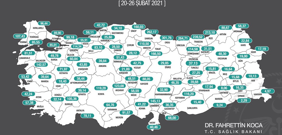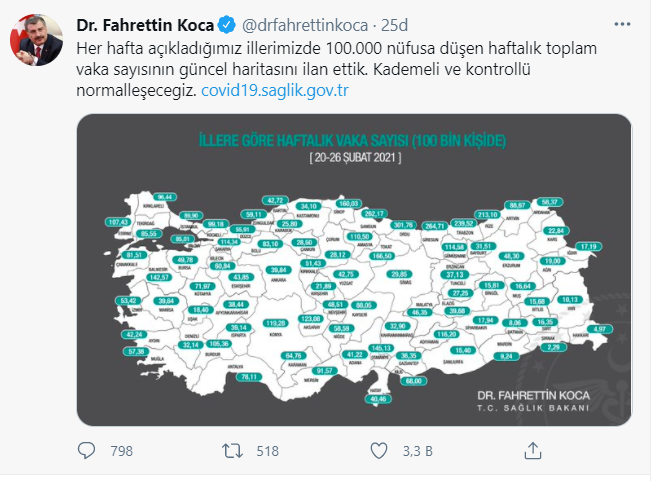 20-26 Şubat haftasında illere göre 100 bin nüfusa düşen vaka sayısının güncel haritasını paylaşan Bakan Koca, açıklamasında şu ifadelere yer verdi, "Her hafta açıkladığımız illerimizde 100.000 nüfusa düşen haftalık toplam vaka sayısının güncel haritasını ilan ettik. Kademeli ve kontrollü normalleşecegiz."