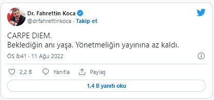 Sağlık Bakanı Fahrettin Koca, sosyal medya hesabından yaptığı paylaşımda, "CARPE DIEM. Beklediğin anı yaşa. Yönetmeliğin yayınına az kaldı." ifadelerine yer verdi.