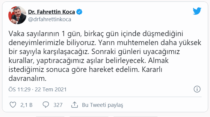 Vaka sayılarının 1 gün, birkaç gün içinde düşmediğini deneyimlerimizle biliyoruz. Yarın muhtemelen daha yüksek bir sayıyla karşılaşacağız. Sonraki günleri uyacağımız kurallar, yaptıracağımız aşılar belirleyecek. Almak istediğimiz sonuca göre hareket edelim. Kararlı davranalım.
