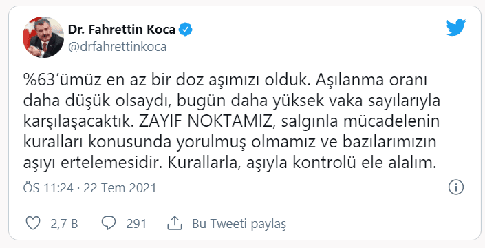 %63’ümüz en az bir doz aşımızı olduk. Aşılanma oranı daha düşük olsaydı, bugün daha yüksek vaka sayılarıyla karşılaşacaktık. ZAYIF NOKTAMIZ, salgınla mücadelenin kuralları konusunda yorulmuş olmamız ve bazılarımızın aşıyı ertelemesidir. Kurallarla, aşıyla kontrolü ele alalım.