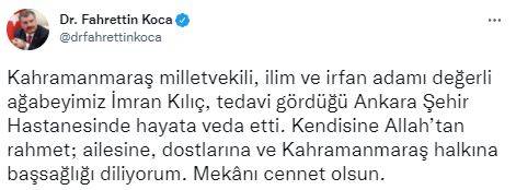 Sağlık Bakanı Fahrettin Koca sosyal paylaşım sitesi Twitter hesabından yaptığı paylaşımda, “Kahramanmaraş milletvekili, ilim ve irfan adamı değerli ağabeyimiz İmran Kılıç, tedavi gördüğü Ankara Şehir Hastanesinde hayata veda etti. Kendisine Allah’tan rahmet; ailesine, dostlarına ve Kahramanmaraş halkına başsağlığı diliyorum. Mekânı cennet olsun” ifadelerine yer verdi.