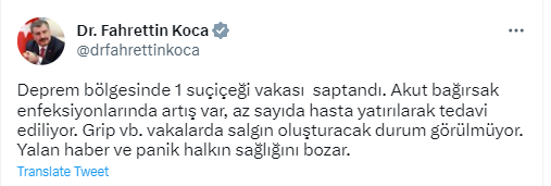 Sağlık Bakanı Fahrettin Koca, Kahramanmaraş merkezli depremlerin etkilediği 10 ile ilişkin açıklamada bulundu. Bakan Koca, "Grip gibi vakalarda salgın oluşturacak durum görülmüyor. Yalan haber ve panik halkın sağlığını bozar” dedi.