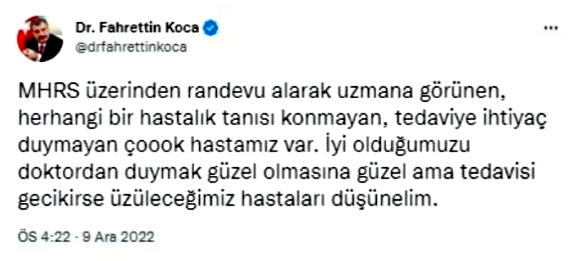 Sağlık Bakanı Fahrettin Koca, sosyal medya hesabından yaptığı paylaşımda, “Merkezi Hekim Randevu Sistemi (MHRS) üzerinden randevu alarak uzmana görünen, herhangi bir hastalık tanısı konmayan, tedaviye ihtiyaç duymayan çok hastamız var. İyi olduğumuzu doktordan duymak güzel olmasına güzel ama tedavisi gecikirse üzüleceğimiz hastaları düşünelim" ifadelerine yer verdi.