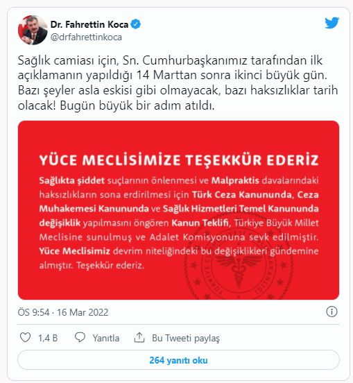 "Bazı şeyler asla eskisi gibi olmayacak, bazı haksızlıklar tarih olacak. Bugün büyük bir adım atıldı. Yüce Meclisimize teşekkür ederiz. Sağlıkta şiddet suçlarının önlenmesi ve Malpraktis davalarındaki haksızlıkların sona erdirilmesi için Türk Ceza Kanununda, Sağlık Hizmetleri Temel Kanununda değişiklik yapılmasını öngören Kanun Teklifi, Türkiye Büyük Millet Meclisine sunulmuş ve Adalet Komisyonuna sevk edilmiştir. Yüce Meclisimiz devrim niteliğindeki bu değişiklikleri gündemine almıştır. Teşekkür ederiz."