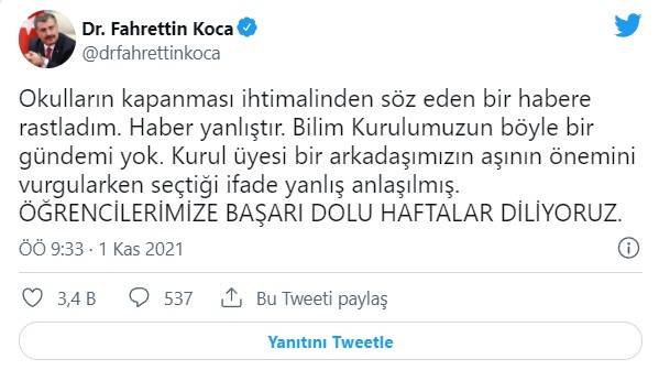 Bakan Koca, "Okulların kapanması ihtimalinden söz eden bir habere rastladım. Haber yanlıştır. Bilim Kurulumuzun böyle bir gündemi yok. Kurul üyesi bir arkadaşımızın aşının önemini vurgularken seçtiği ifade yanlış anlaşılmış. ÖĞRENCİLERİMİZE BAŞARI DOLU HAFTALAR DİLİYORUZ." dedi.