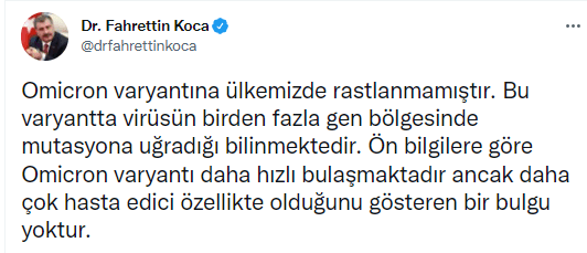 Koronavirüs verilerini Twitter hesabından paylaşan Sağlık Bakanı Fahrettin Koca, "Omicron varyantına ülkemizde rastlanmamıştır." diyerek, yeni varyanta ilişkin şunları söyledi: