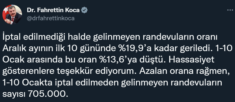 "İptal edilmediği halde gelinmeyen randevuların oranı aralık ayının ilk 10 gününde yüzde 19,9’a kadar geriledi. 1-10 Ocak arasında bu oran yüzde 13,6’ya düştü. Hassasiyet gösterenlere teşekkür ediyorum. Azalan orana rağmen, 1-10 Ocakta iptal edilmeden gelinmeyen randevuların sayısı 705 bin."