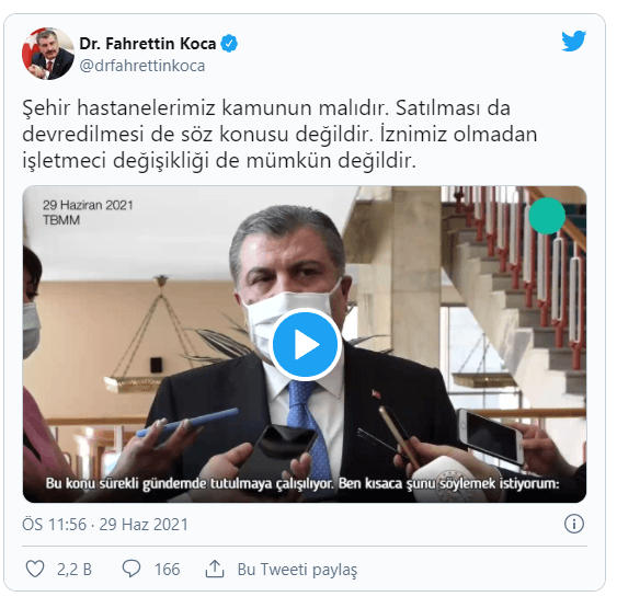 Sağlık Bakanı Koca sosyal medyadan yapığı paylaşımda şehir hastanelerinin kamu malı olduğunu ve satılması ya da devredilmesinin mümkün olmadığını açıkladı.