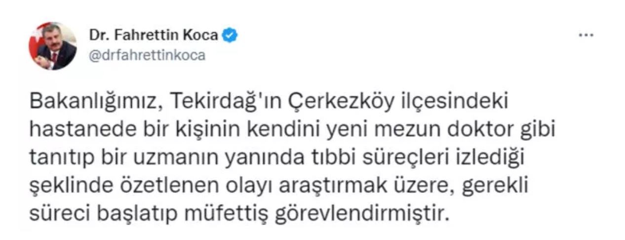 Sağlık Bakanı Fahrettin Koca, yaptığı açıklamada, "Bakanlığımız, Tekirdağ'ın Çerkezköy ilçesindeki hastanede bir kişinin kendini yeni mezun doktor gibi tanıtıp bir uzmanın yanında tıbbi süreçleri izlediği şeklinde özetlenen olayı araştırmak üzere, gerekli süreci başlatıp müfettiş görevlendirmiştir." ifadelerini kullandı.