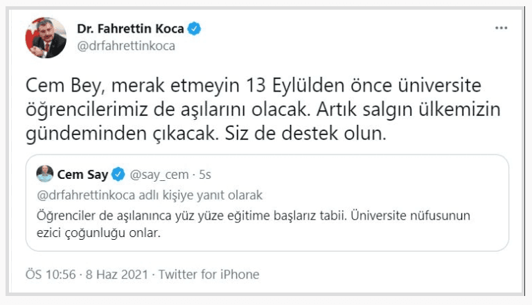 Bakan Koca, takipçisine verdiği cevapta "Cem Bey, merak etmeyin 13 Eylül'den önce üniversite öğrencilerimiz de aşılarını olacak. Artık salgın ülkemizin gündeminden çıkacak. Siz de destek olun" ifadelerini kullandı.