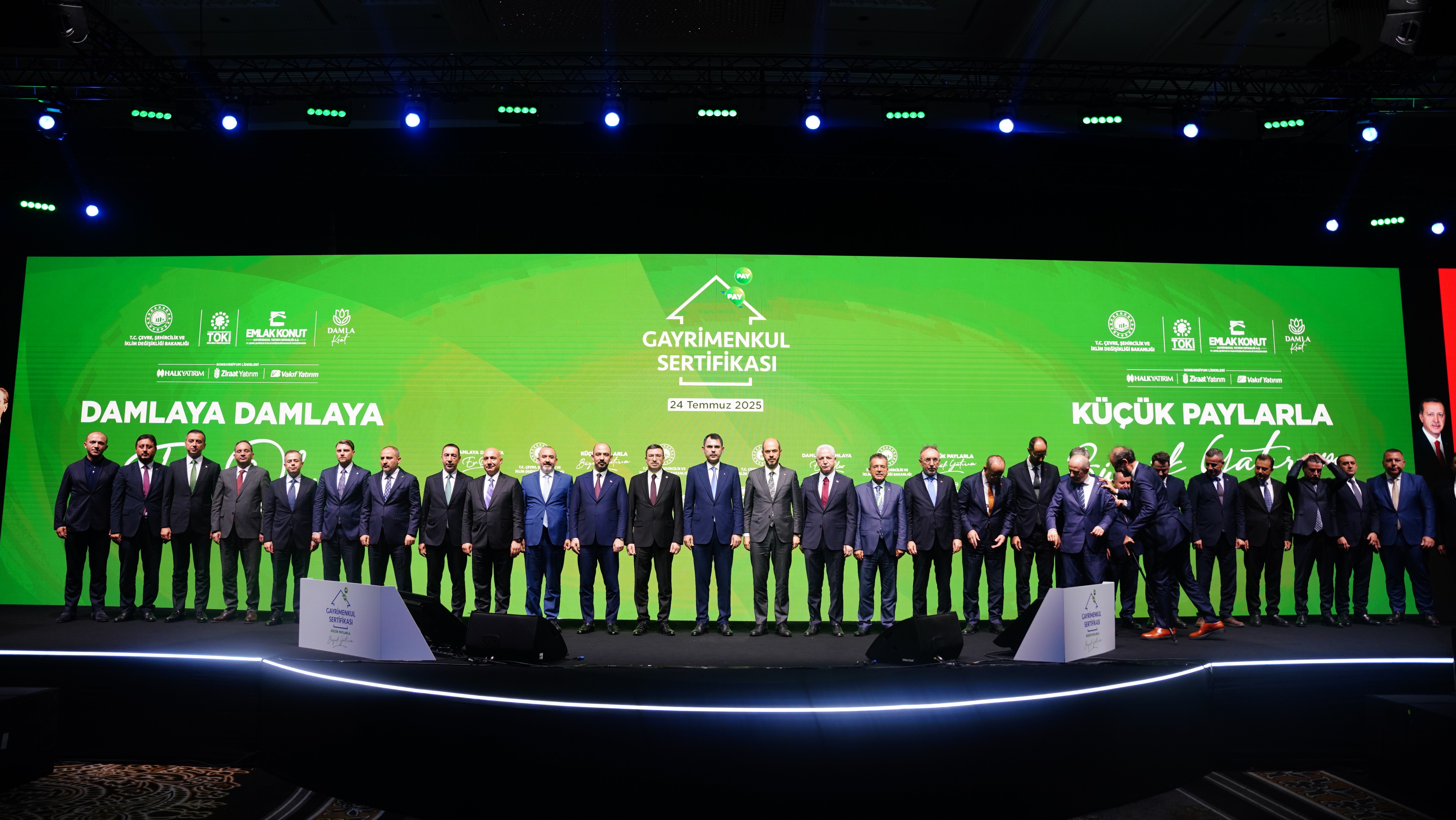 Çevre, Şehircilik ve İklim Değişikliği Bakanı Murat Kurum, İstanbul’da düzenlenen Gayrimenkul Sertifikası Tanıtım Toplantısı’na katıldı. Bakan Kurum, Eskişehir’deki orman yangınında şehit olan orman işçileri ve AKUT gönüllülerine Allah’tan rahmet, yakınlarına baş sağlığı dileyerek konuşmasına başladı. Toplantıda Gayrimenkul Sertifikası ile hayata geçirilecek projenin detaylarını açıklayan Bakan Kurum, “’Damlaya damlaya ev olur’ diyor. Milletimizin en büyük hayallerinden biri olan ev sahibi olma hayalini gerçeğe dönüştürüyoruz. Birikimi olmayan vatandaşlarımızın çok cüzi miktarlarla ev sahibi olmalarını sağlayacak çok büyük bir adım atıyoruz” dedi.