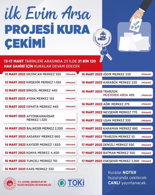 Altyapısı tamamlanan ve imar planı hazırlanan 1 milyon "İlk Evim Arsa" kuralarına da 13-17 Mart arasında devam edilecek. 23 ilde, 21 bin 120 müstakil ve müşterek arsa hak sahiplerinin belirleneceği çekilişlerin illere göre dağılımı ve kura tarihleri şöyle: