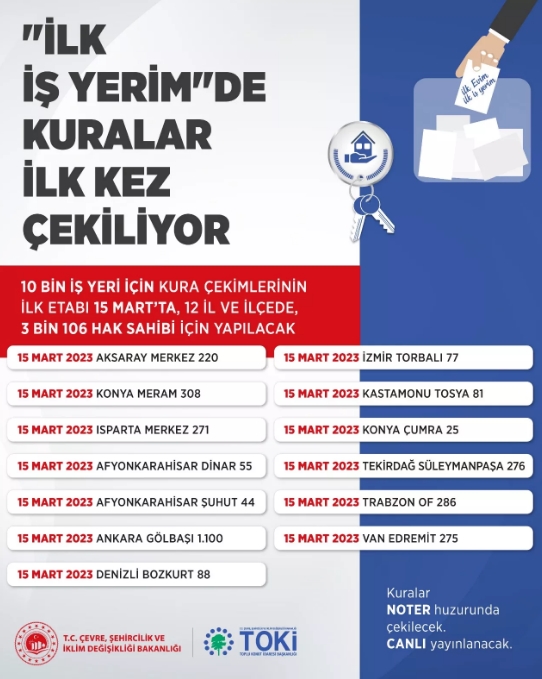 Kurum, "Vatandaşımızı iş sahibi de yapıyoruz. Konut ve arsa kuralarımız devam ederken sıra iş yerlerine geldi. 12 ilde, 3 bin 106 iş yeri için 15 Mart'ta kuraları çekmeye başlıyoruz." bilgisini verdi.
