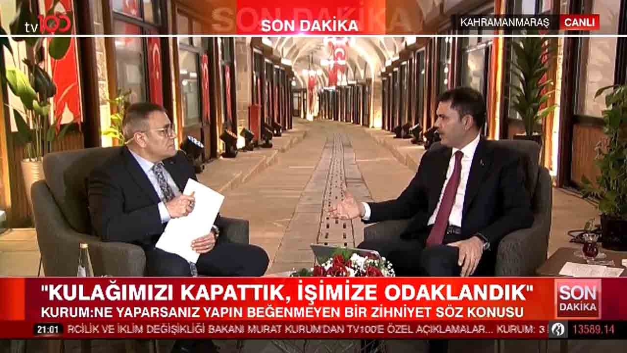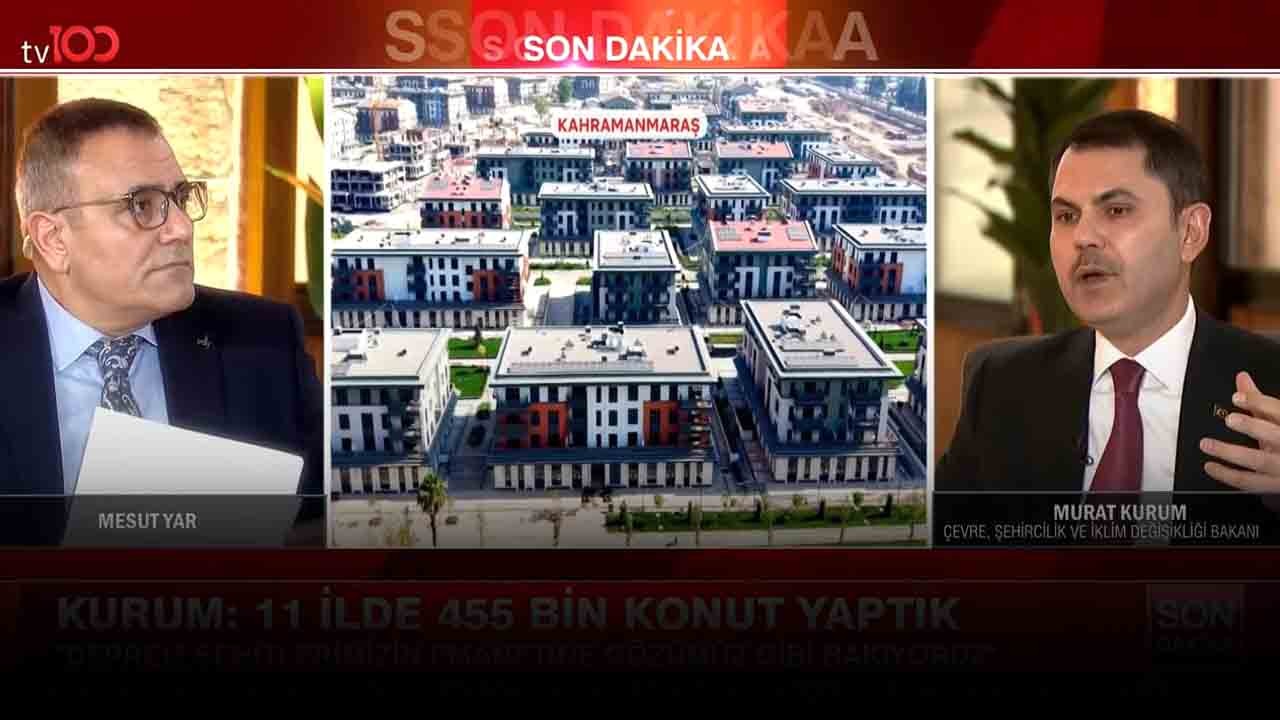 Kahramanmaraş’ta gerçekleştirilen TV100 canlı yayınına katılan Çevre, Şehircilik ve İklim Değişikliği Bakanı Murat Kurum, CHP Genel Başkanı Özgür Özel’in ‘deprem bölgesinde afet konutları için boş senet imzalatılıyor, faizle satılacak’ iddialarına bir kez daha tepki gösterdi.
