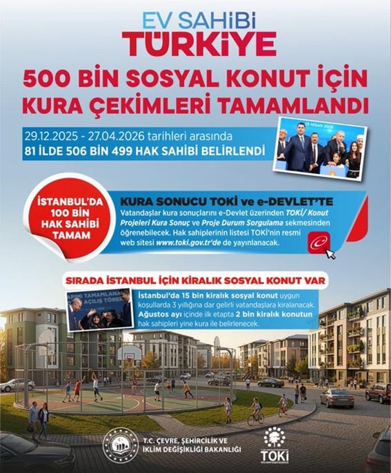 81 ilde 500 bin sosyal konut için kura süreci tamamlandı. Sosyal medya hesabından paylaşım yapan Çevre, Şehircilik ve İklim Değişikliği Bakanı Murat Kurum, “Yüzyılın Konut Projesi'nde ilk aşama tamam. İstanbul’da 100 bin yuvamızın kuralarını çektik, sahiplerini belirledik. Noter onayı sonrası kesin listeleri toki.gov.tr’den öğrenebilirsiniz. Böylece İstanbul ile birlikte 81 ilimizde tüm kura süreçlerini tamamlamış olduk. Şimdi hızla temelleri atacak, evlerimizi en kısa sürede teslim edeceğiz. Cumhurbaşkanımız Sayın Recep Tayyip Erdoğan liderliğinde 500 bin ailemizi daha ev sahibi yapacağız” mesajını verdi. Cumhurbaşkanı Recep Tayyip Erdoğan’ın 24 Ekim 2025’te açıkladığı “Ev Sahibi Türkiye” sloganlı Yüzyılın Konut Projesi ile Türkiye tarihinin en büyük sosyal konut projesi için harekete geçildi. Çevre, Şehircilik ve İklim Değişikliği Bakanlığı koordinesinde Toplu Konut İdaresi Başkanlığı (TOKİ) tarafından 81 ilde 500 bin sosyal konutun inşa edileceği proje için başvurular 10 Kasım 2025’te başladı. 1 milyon 72 bin 660’ı İstanbul’dan olmak üzere Türkiye genelinde toplam 5 milyon 242 bin kişinin başvurusu geçerli başvuru olarak kabul edildi. Kura takvimi ise 29 Aralık 2025’te Adıyaman’da başladı. İl il noter huzurunda çekilen kuralar sonucu ev sahibi olacak vatandaşlar belirlendi. İstanbul’da 3 gün süren kura çekimi sonucunda 100 bin hak sahibi belirlendi. 27 Nisan’da İstanbul kurasının sona ermesiyle birlikte projenin kura takvimi tamamlanmış oldu. Böylece 29 Aralık 2025 – 27 Nisan 2026 tarihleri arasında 81 ilde 506 bin 499 hak sahibi belirlenmiş oldu.