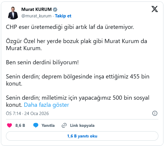 Bakan Kurum, Özgür Özel’in sıklıkla kendisini anarak gündem oluşturmaya çalıştığına dikkat çekerek, "CHP eser üretemediği gibi artık laf da üretemiyor. Özgür Özel her yerde bozuk plak gibi Murat Kurum da Murat Kurum. Ben senin derdini biliyorum! Senin derdin; deprem bölgesinde inşa ettiğimiz 455 bin konut. Senin derdin; milletimiz için yapacağımız 500 bin sosyal konut. Rüyanda bile göremeyeceğin eserleri biz üretiyoruz diye aklın çıkıyor" mesajını paylaştı.