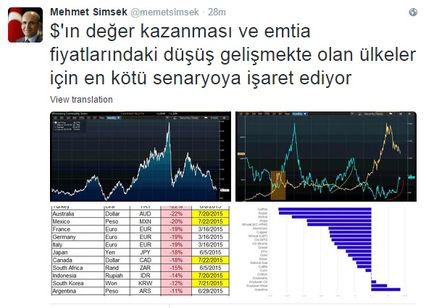 Maliye Bakanı Mehmet Şimşek, Twitter'daki paylaşımında, ''Doların değerin kazanması ve emtia fiyatlarındaki düşüş gelişmekte olan ülkeler için en kötü senaryoya işaret ediyor'' değerlendirmesinde bulunduz