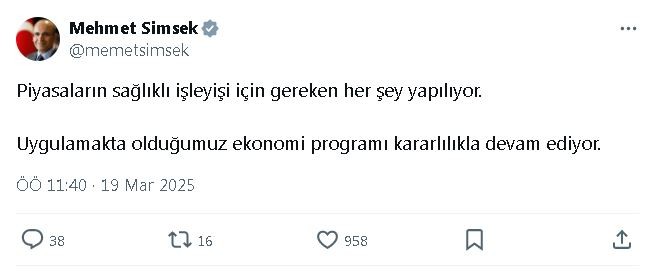 Hazine ve Maliye Bakanı Mehmet Şimşek, sosyal medya hesabından piyasalara ilişkin açıklamalarda bulundu.